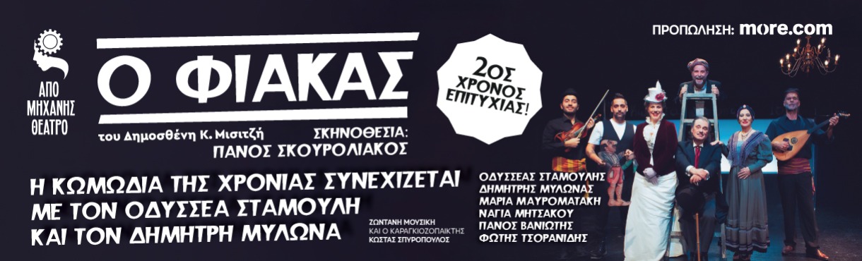 «Ο Φιάκας» του Δημοσθένη Κ. Μισιτζή σε σκηνοθεσία Πάνου Σκουρολιάκου που μέχρι στιγμής την έχουν παρακολουθήσει πάνω από 10.000 θεατές, συνεχίζεται στο «Από Μηχανής» Θέατρο με τον Οδυσσέα Σταμούλη στο ρόλο του αξιαγάπητου απατεώνα Φιάκα και τον Δημήτρη Μυλωνά στο ρόλο του παμπόνηρου υπηρέτη του, Γιάννη.