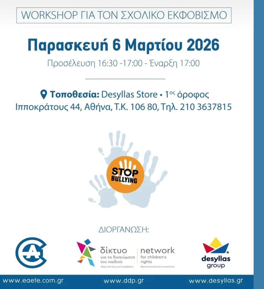 On SightΜε αφορμή την Παγκόσμια Ημέρα κατά της Ενδοσχολικής Βίας και του Εκφοβισμού, η Ένωση Ανταποκριτών Ελληνικού Τύπου Εξωτερικού (ΕΑΕΤΕ), σε συνεργασία με το Δίκτυο για τα δικαιώματα του Παιδιού και την εκδοτική εταιρεία παιχνιδιών και βιβλίων, Δεσύλλας,διοργανώνουν μια επίκαιρη και ουσιαστική συζήτηση, με θέμα την αντιμετώπιση του εκφοβισμού σε όλες του τις εκφάνσεις, την Παρασκευή, 6 Μαρτίου 2026, στις 17:00, στο Desyllas Store – Κατάστημα Δεσύλλας, Ιπποκράτους 44, Αθήνα, Τ.Κ. 106 80.